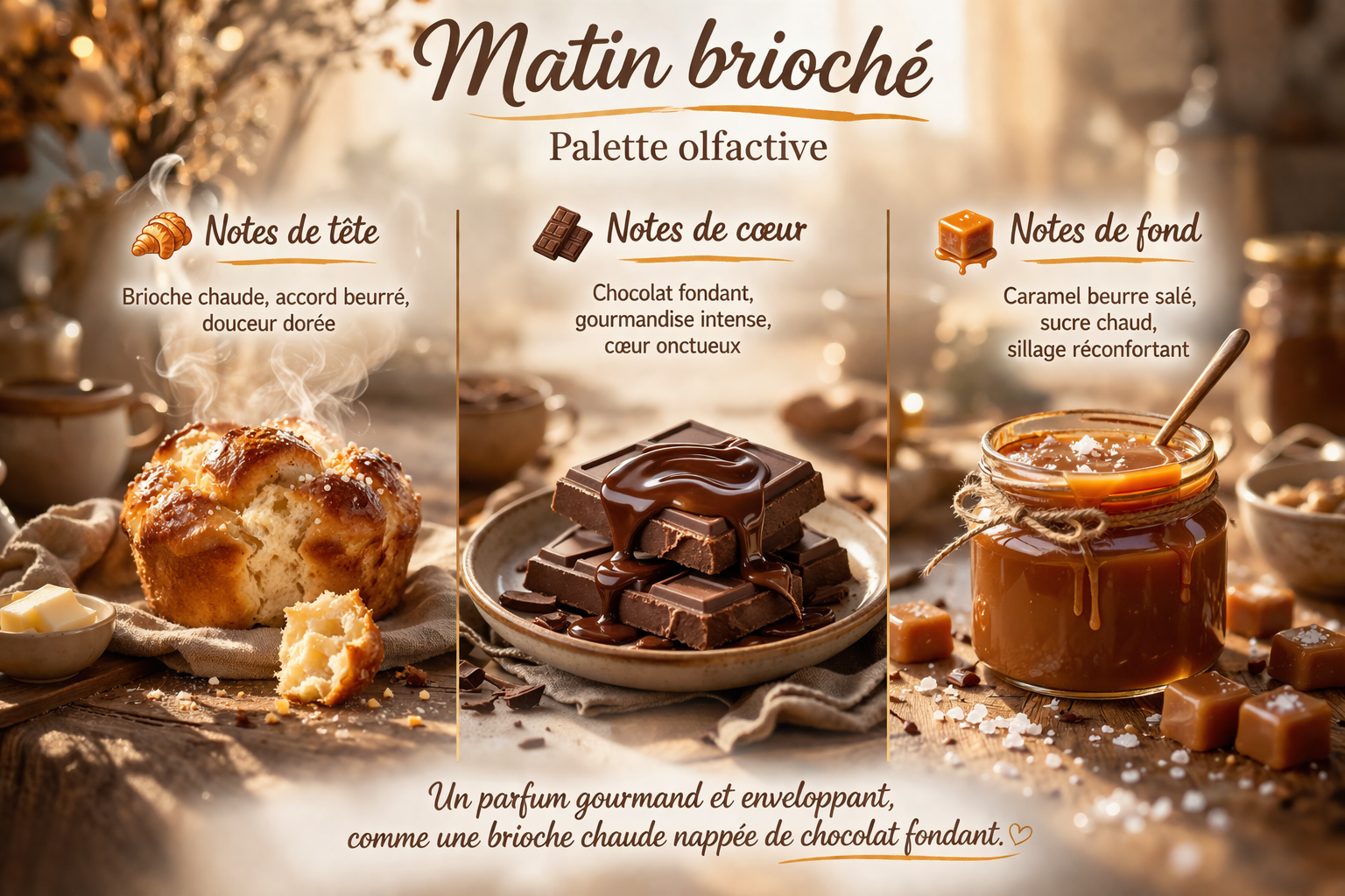 Fond : caramel beurre salé, sucre chaud, sillage réconfortant