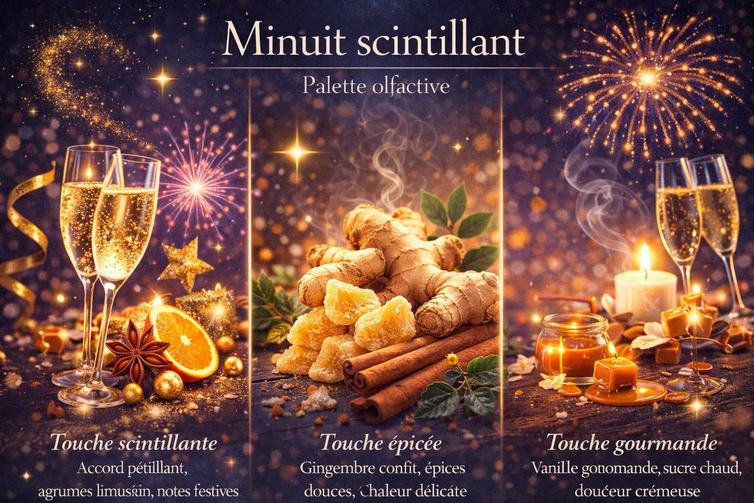 MINUIT ÉTINCELANT, c’est comme un feu d’artifice dans un verre de champagne. T’imagines les bulles, la fête, les paillettes… mais avec un twist épicé bien senti. Bonne Année, c’est le parfum qui pétille, lumineux, frais, presque rosé. Et le gingembre confit vient électriser le tout avec un effet chaud-froid carrément stylé. C’est vibrant, c’est claquant, c’est la soirée de l’année en flacon. Porté, il laisse une empreinte joyeuse, effervescente et un peu rebelle.