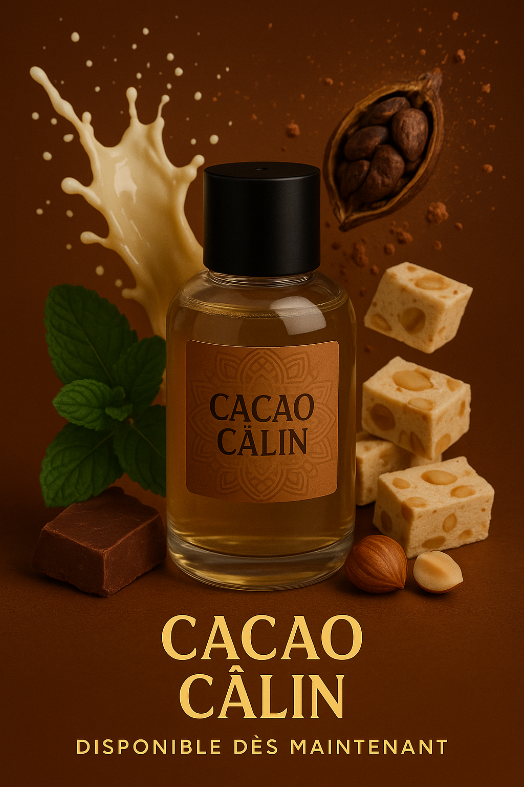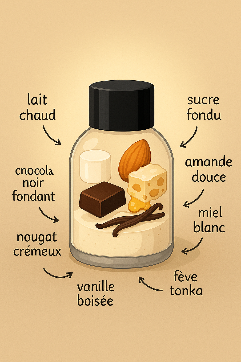 Un nuage de lait chaud et de sucre fondu enlace la peau dès les premières notes, avant de laisser place à un cœur tendre de chocolat noir fondant et de nougat crémeux. Le tout se mêle à la douceur de l’amande et du miel blanc, rappelant les gourmandises partagées dans la chaleur d’un après-midi d’hiver.
