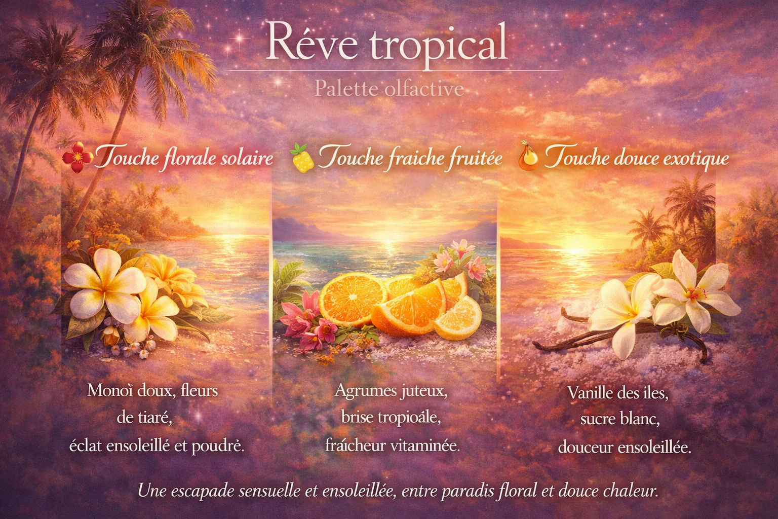 Un souffle d’ailleurs, entre éclats d’agrumes, fleurs baignées de soleil et vanille fondante. Une invitation à s’abandonner à la douceur d’un été éternel.